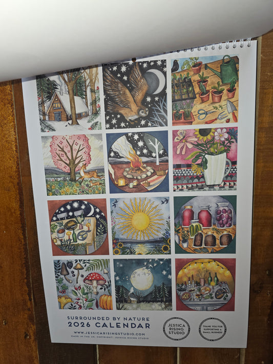 Beautifully illustrated 2026 calender surrounded by nature